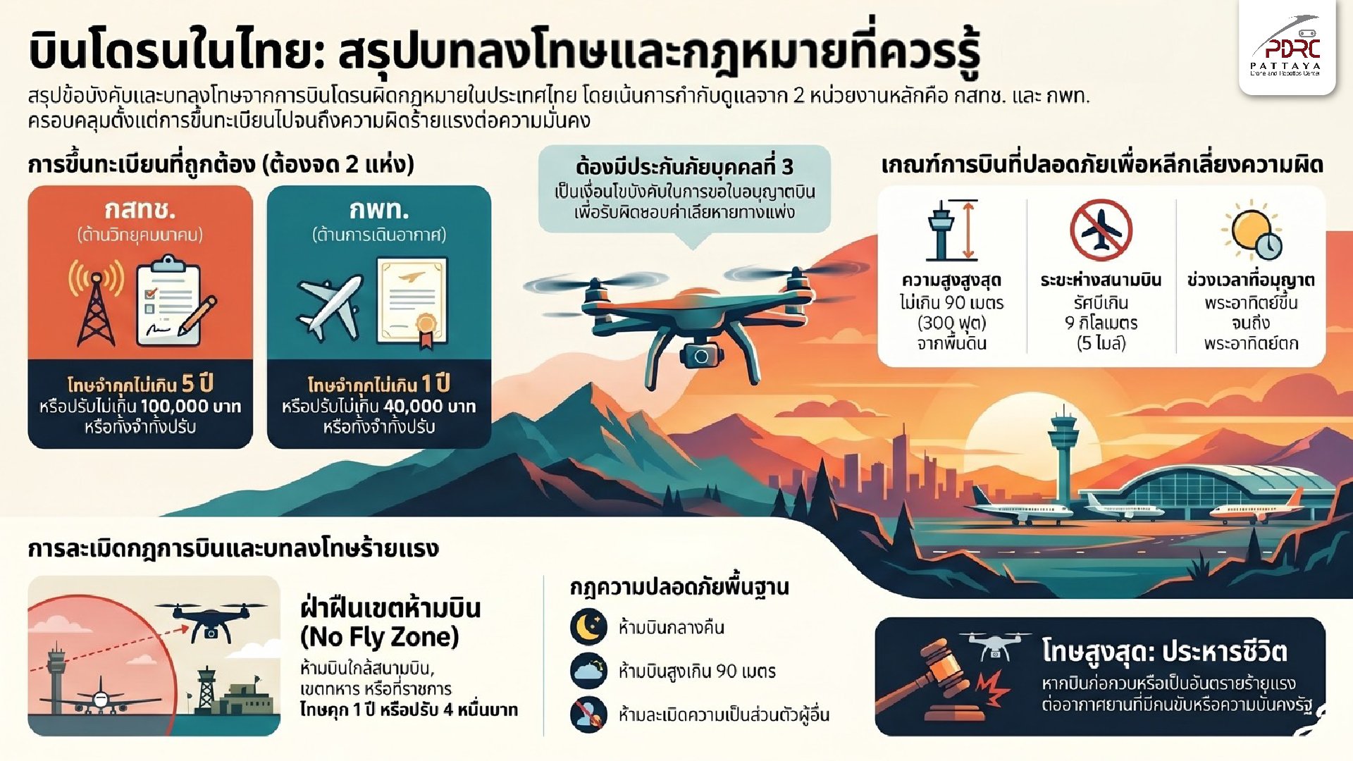 • ไม่ขึ้นทะเบียนกับ กพท. (ความผิดด้านการเดินอากาศ): * บทลงโทษ: จำคุกไม่เกิน 1 ปี หรือปรับไม่เกิน 40,000 บาท หรือทั้งจำทั้งปรับ