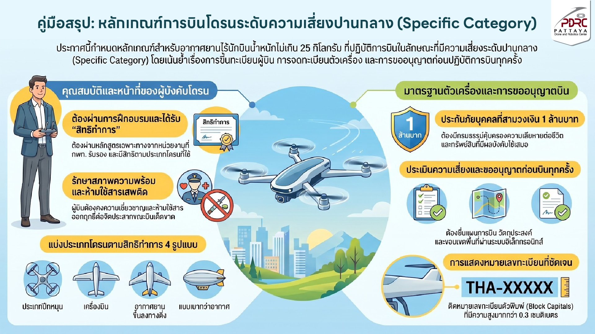 ประกาศฉบับนี้กำหนดเกณฑ์สำหรับโดรนที่ต้องการบิน "นอกเหนือหรือแตกต่าง" จากเงื่อนไขปกติ ซึ่งการบินในลักษณะนี้จะถูกจัดอยู่ในกลุ่ม การปฏิบัติการบินที่มีความเสี่ยงระดับปานกลาง (Specific Category) โดยมีประเด็นสำคัญที่ควรรู้ ดังนี้: